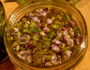 According to references cited in Mrs Grieve, the constituents are well extracted in water so my first experiment was a nice cup of Speedwell tea. I followed this up by making an infused oil, to see if the skin healing properties could work in this medium as well as as a simple wash. I haven’t strained the oil yet so can’t report back until I do, but its certainly looking promising and has taken on a lovely light green shade.