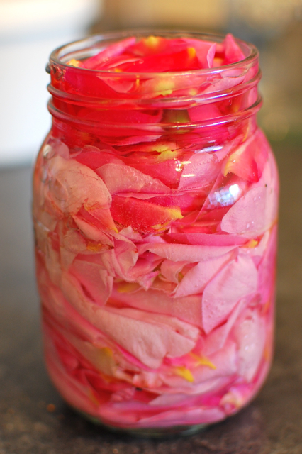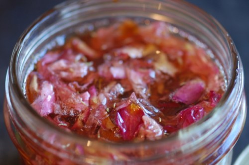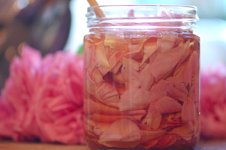 Rose is also wonderful as an infused honey, especially made with fresh petals as you don’t have to strain them out and can just eat the whole thing as it is. This also makes a lovely soothing remedy for sore throats. Kiva Rose recommends a diluted Rose infused vinegar for treating sunburn as it’s cooling, soothing and astringent. I also love rose infused vinegar in a simple salad dressing as it transforms a few veggies into something decadent and delicious. Debs did a lovely post on making rose infused vinegar which you can read here.