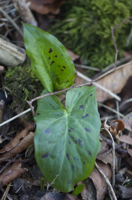 Lords and Ladies on the other hand has a broad arrow shaped leaf, with a more wrinkled appearance. However the mature leaf shape may not be fully present in the youngest leaves so the most important thing to notice is the difference in patterning of the veins. In Lords and Ladies they are pinnate, meaning the secondary veins are paired oppositely, emerging out to the edge of the leaf from the central vein. On close inspection they look quite different from the parallel veins of wild garlic.